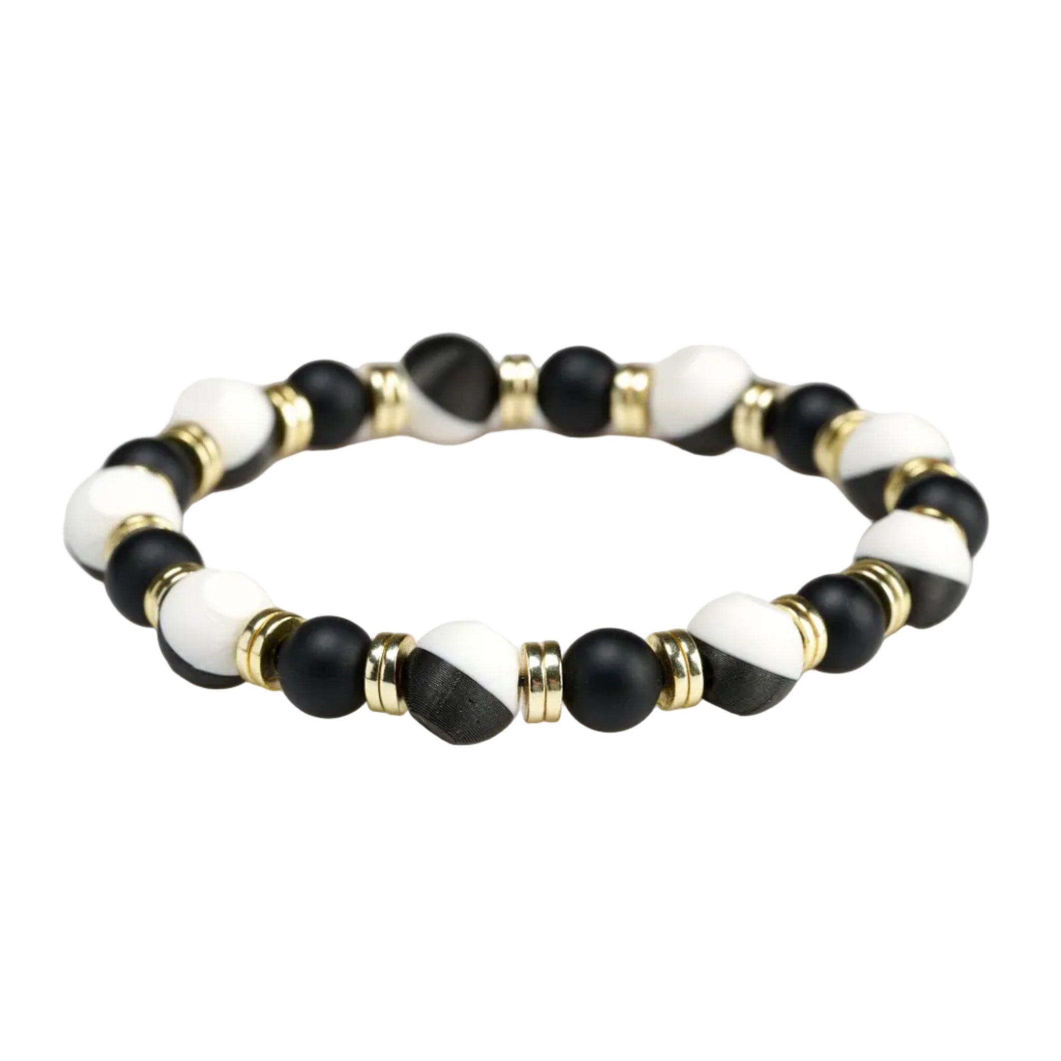 Each piece features alternating white and gold composite beads accented by polished metal spacers. The result is a balanced design that feels substantial without being heavy.