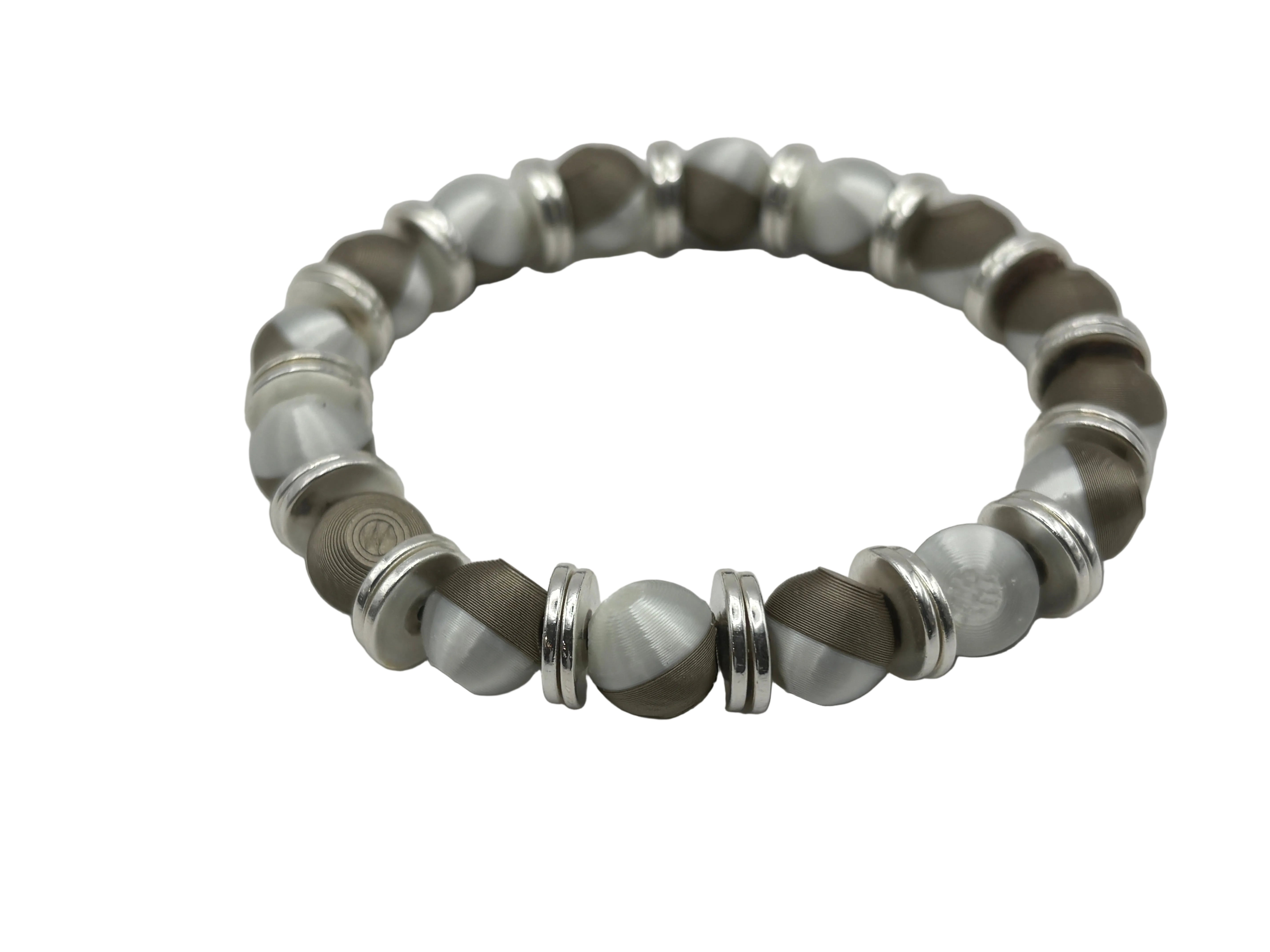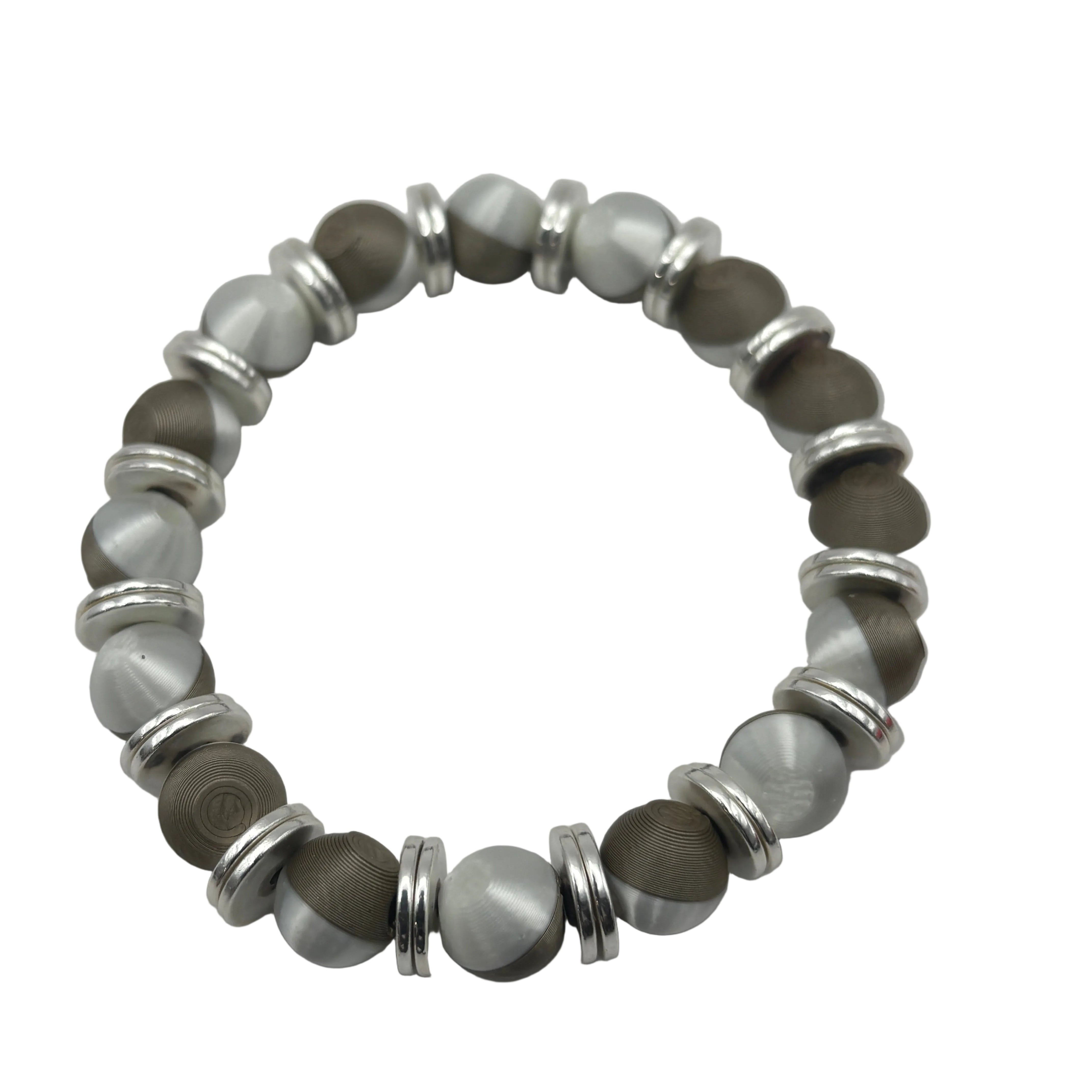 Two-Tone Bracelet blends brushed silver/gold tones with textured gunmetal accents for a modern, grounded look. Designed for everyday wear, this stretch-fit bracelet pairs precision-machined beads with polished spacers for a clean, structured profile.